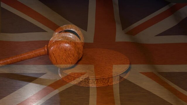A balance scale symbolizes justice, set against a backdrop of the British flag.