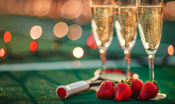 Luxury sporting tennis event with glasses of champagne and strawberries on a tennis court.