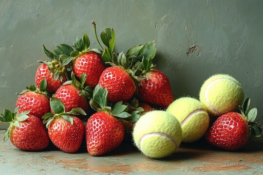 Fresh Strawberries and Tennis Balls in a Vibrant Still Life on a Textured Green Background