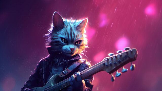 Hard rock metal guitarist cat with unruly long fur hair and cool leather jacket playing an electric guitar on concert stage - insanely wild and unique feline portraiture illustration - generative AI