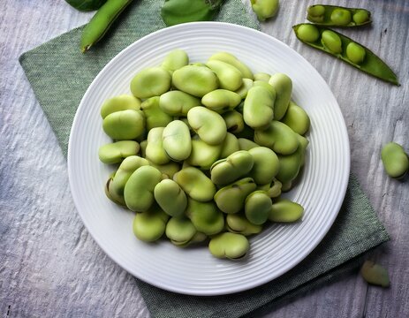Fresh broad beans on a white plate on table. Generated image