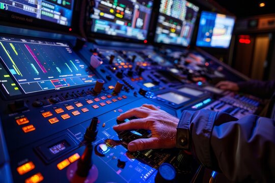Broadcast Tv Studio Production - Vision Switcher Studio Director broadcast video mixer operation - Close-up of hand. Hands of a cinematographer who worked on the vision mixer, switch the TV panel.