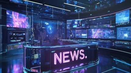 Futuristic news studio with digital displays and glowing 'NEWS' sign.
