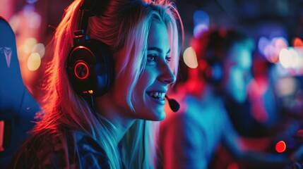 A woman is pictured wearing headphones and holding a microphone. This image can be used for various purposes, such as podcasting, broadcasting, music production, or voice recording