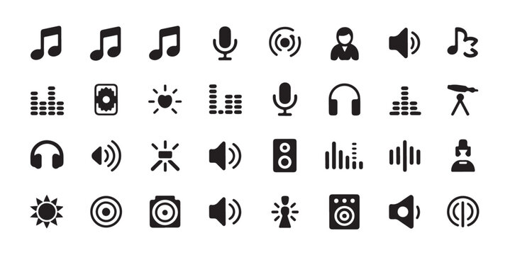 Audio equipment icons: speakers, subwoofer, mixer, antennas, amplifiers, monitor