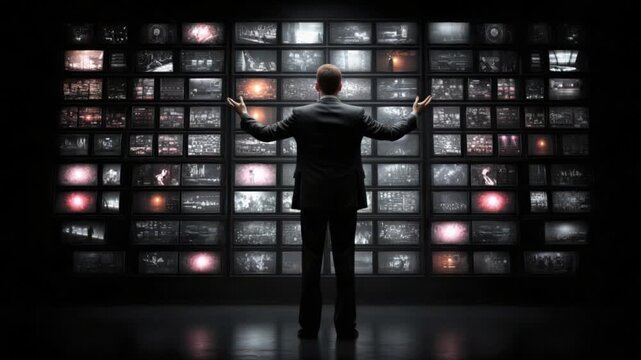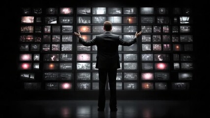 AI generated video: Businessman managing vast digital information on a multi-screen wall, showcasing data control and media surveillance.