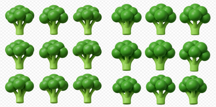 A detailed collection of fresh green broccoli illustrations, including whole heads and cut florets.