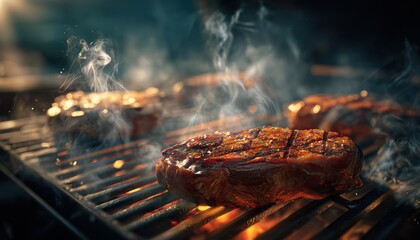 Sizzling Steaks On The Barbecue Grill: Emitting Flavorful Smoke, Ideal For A Summer Cookout.