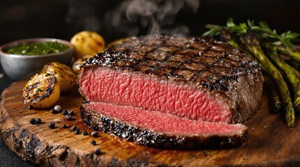 London broil steak sliced on wooden board reveals perfect medium-rare interior with caramelized crust served with roasted potatoes, asparagus and chimichurri sauce