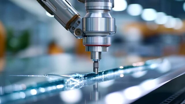 Automated glass cutting and edging systems are shown producing custom-sized panels. A robotic arm with a precision cutter scores a large sheet of glass, which is then cleanly broke