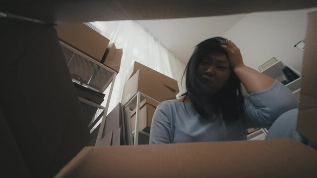 Asian woman unpacking parcel box, upset with broken items, bad shipping service