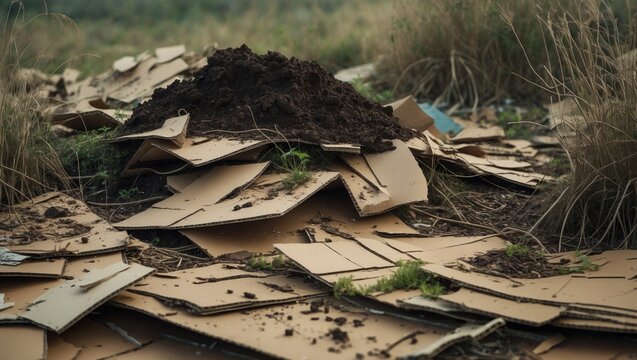 A pile of broken cardboard and soil in an outdoor environment with grass and plants.