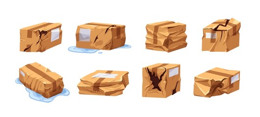 Damaged broken cardboard boxes, delivery packages set. Wet, crumpled, crinkled, spoiled carton parcels, goods orders. Torn wrinkled sealed cargo. Flat vector illustration isolated on white background