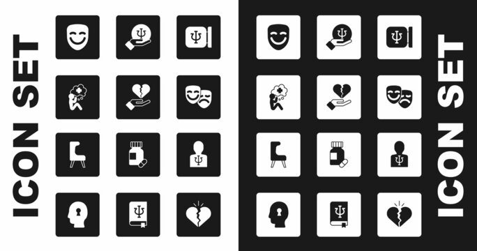 Set line Psychology, Psi, Comedy theatrical mask, Metronome with pendulum, Depression, Solution to problem, Broken heart or divorce and Head question mark icon. Vector