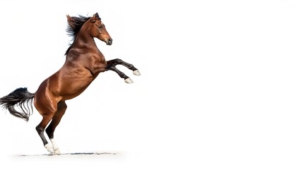 Bucking bronc bronco horse with mane and tail hair showing movement.  Front legs in air,  wild free attitude.  isolated on white background with copy space