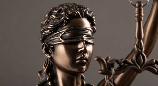 A statue of a woman holding scales and a blindfold. The statue is placed in front of a bookshelf