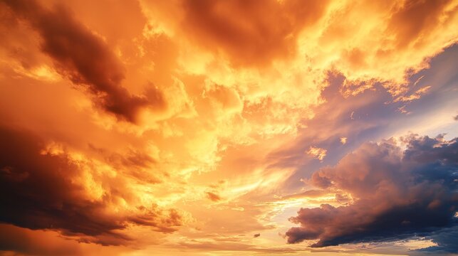 93.A tranquil yet dramatic scene of a golden sunset, where soft, wispy clouds merge with dark, brooding storm formations, adding depth and movement to the vibrant sky.