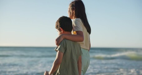 Back, beach or nature holding hands with a brother and sister on the sand by the ocean in summer together. Family, love or vacation with a girl and boy sibling outdoor on the coast for holiday travel