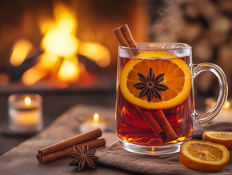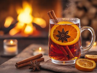 Mulled wine with cinnamon sticks, orange slices, and star anise, steaming in a glass mug by a crackling fireplace
