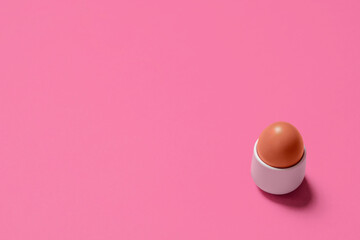 High angle view of brown egg in bowl on pink background