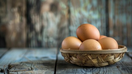 A wicker basket filled with brown eggs resting on straw, placed on a rustic wooden table with a dark green background