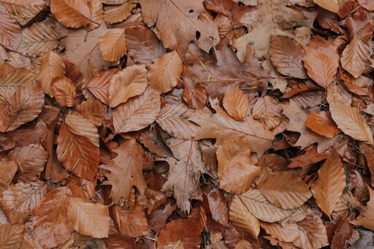 Closeup of a stack of dry, brown leaves on the ground in autumn