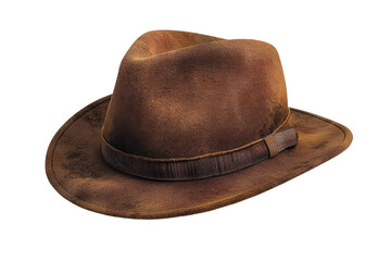 A weathered brown fedora with a leather band. The hat has a distressed look and is slightly tilted to the side.