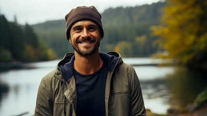 A smiling person wearing a brown hat stands on a sandy beach with greenery and sunbathers in the background.