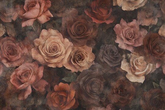 Vintage floral pattern with mocha mousse color 2025. Romantic roses in muted earth tones. Retro wallpaper design for Valentine's Day or wedding invitation background