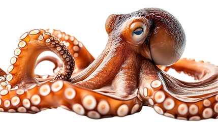 Large brown octopus with white tentacles on light gray background. Distinctive head with big eye and small mouth. Octopus faces right side of image. Octopus is isolated on transparent background.
