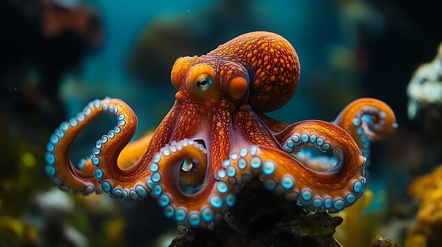 Close-up of a vibrant orange and blue octopus with large, curious eyes.