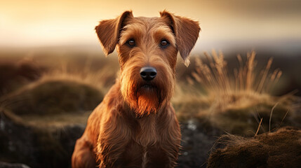 Small Jack Russell terrier dog in forest, standing on fallen tree, looking to side, closeup detail