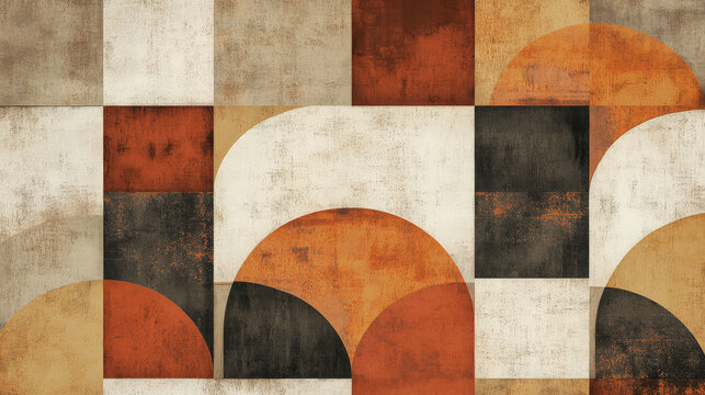 A flat geometric pattern featuring layered semicircles and squares in warm earth tones of brown, rust, and beige, creating a modern, structured composition.