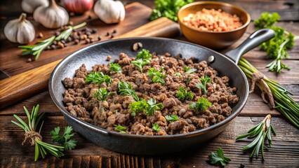 Savory, perfectly browned ground beef fills a stainless steel skillet, garnished with chopped fresh herbs and a