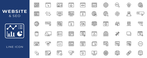 Website line icon set. Containing web design, internet, content, SEO, hosting, blog, homepage, e-commerce line icon collection set.