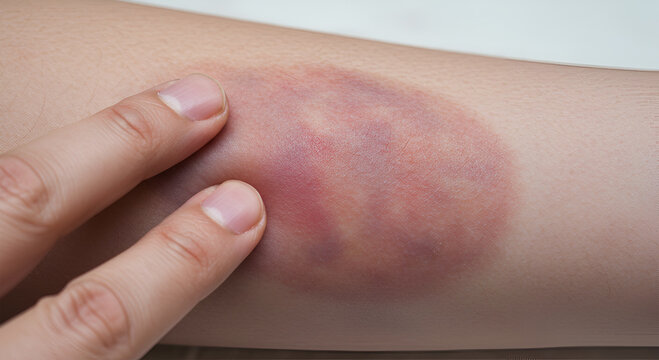 Close-up view of a human arm showing a large, discolored bruise with a finger touching it.
