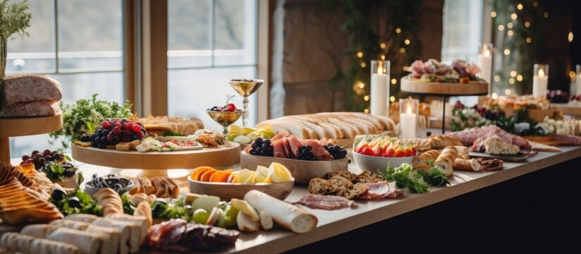 Elegant holiday brunch table adorned with sparkling champagne flutes, assorted pastries, and festive decorations, capturing the warmth and joy of a seasonal celebration.