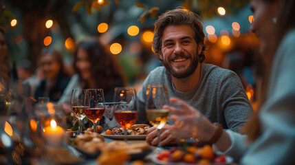 Group of friends, young men and women doing barbecue in nature, happy people sit at the table and have dinner, have fun at picnic, summer time concept, friendship