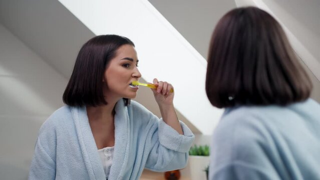 Oral care concept. Young indian man cleaning teeth with toothbrush, smiling to his reflection in mirror