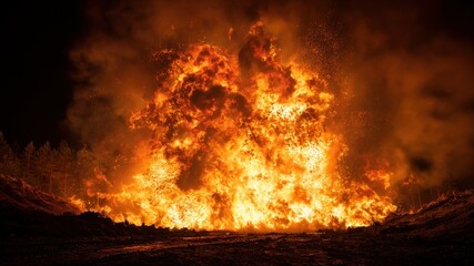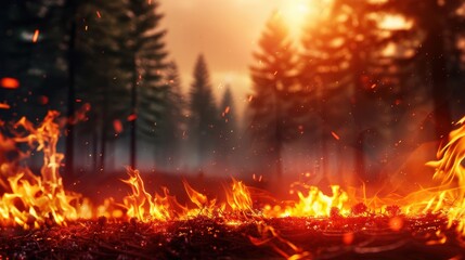 An intense forest fire engulfing trees with dramatic flames and smoke, showcasing the raw power of nature and the urgent need for environmental protection and awareness.