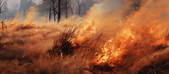 Fierce brushfire consuming dry grasses in autumn landscape smoke billowing through charred fields yellow and orange flames in foreground