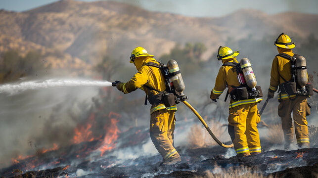 Firefighters fighting a wildfire. Firemen extinguishing a blazing wild fire in nature.