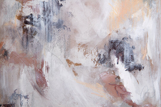 The artwork showcases a detailed texture of neutral oil paint with soft peach and cream colors creating dynamic brush strokes and layers