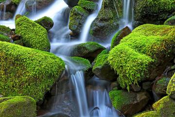 Close-up of moss-covered (Bryophyta) rocks with a cascading waterfall; Hawaii, United States of America