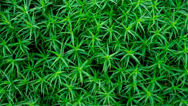 Close up of green moss growing on the forest floor with small leaves scattered throughout the carpet of bryophytes providing a natural textured background