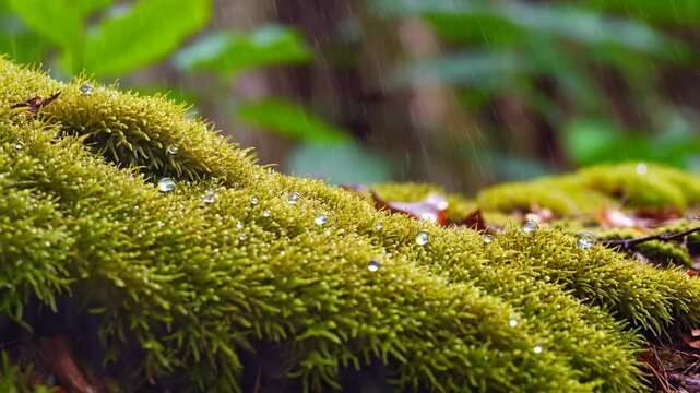 Close-up view of vibrant green moss with glistening water droplets clinging to its soft, textured surface during a rain shower.