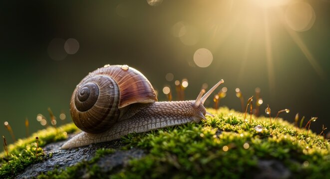 Snail on mossy rock illuminated by sunlight showcasing its textured shell and the surrounding dewkissed bryophytes
