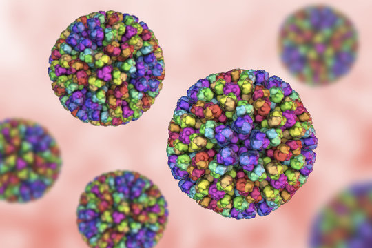 Bluetongue virus BTV, 3D illustration. A virus transmitted by the midge Culicoides, causes Bluetongue disease at ruminants, mainly sheep, characterized by fever and swollen, cyanotic tongue