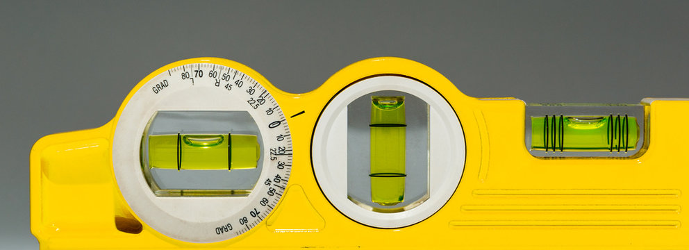 Tools, blue bubble level and measuring tape on a decorated wood table