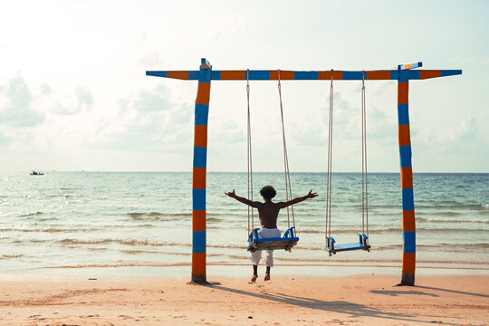 Man relaxes on a swing overlooking the ocean, embracing the beauty of an exotic tropical paradise